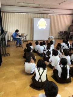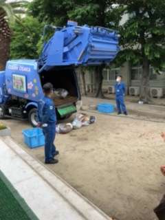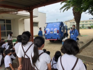 環境局の方がごみの分別やパッカー車のしくみについて映像で説明し、実際にパッカー車を見て学習をしました。パッカー車のごみの出し入れを見てびっくりしていました。