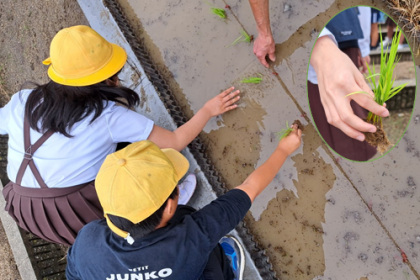 1時間目に社会科「米作りのさかんな地域」の学習と関連して、学習園の一角に設けた水田に稲の苗をみんなで植えました。倒れずにしっかり根が張り、立派な稲穂を実らせるために、田に対して垂直にしっかりと植えました。