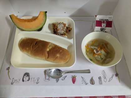 「鶏肉と野菜のスープ」は、鶏肉、じゃがいも、キャベツ、にんじん、コーン、パセリを使用し、彩りよく仕上げました。