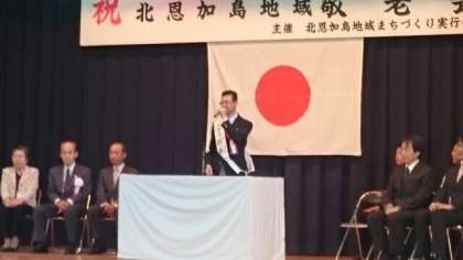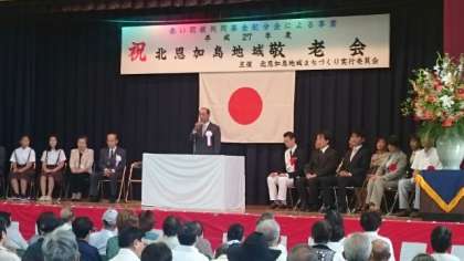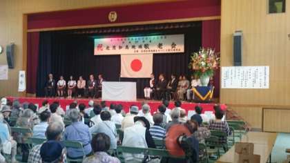 20日(日)、本校講堂にて、北恩加島地域の敬老会が行われました。500名近い高齢者の方々がご参加され盛大な会となりました。開式の言葉で社会福祉協議会の安藤会長がご挨拶されました。また、筋原区長からお祝いのことばをいただきました。区長のお話によると、区内100歳以上の方は19名おられ、女性が多いとのことです。最高齢の方も女性だそうです。