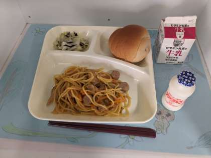 「チキントマトスパゲッティ」は、鶏肉、ウインナーを主材に、たまねぎ、トマト(缶)、にんじん、ピーマンを使用し、バジルで風味をつけたトマト味のスパゲッティです。
