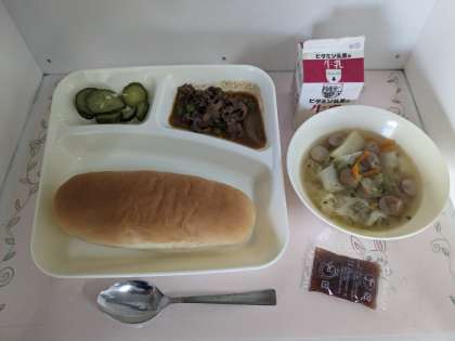 「スープ」は、じゃがいも、キャベツ、にんじん、彩りにパセリを使用しています。ウインナーの旨みをいかしたスープです。