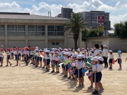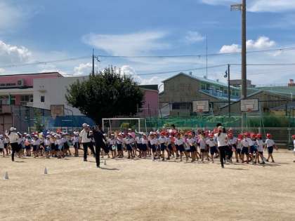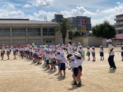 ミッキーマウスマーチに合わせて、隊形を変えながら軽快に踊る1.2年生。みんな一生懸命です。一つ一つの動きが可愛らしくて、思わず見入ってしまいます。