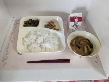 「かぼちゃのみそ汁」は、うすあげ、かぼちゃ、たまねぎ、彩りにこまつなを使用したみそ汁です。