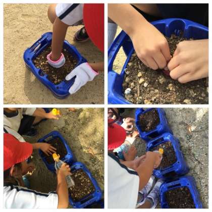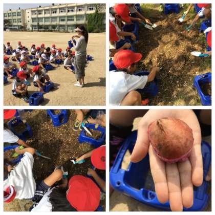 チューリップの球根を自分の鉢植えに植えました。ふかふかのお布団に向きを考えていれなきゃ!と、上手に植えることができました。