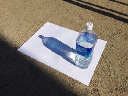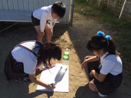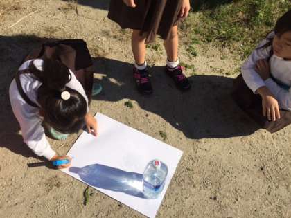 運動場にある日なたにペットボトルを立て、下に敷いた画用紙に影の位置を定期的に書き込む活動をしました。