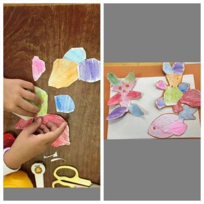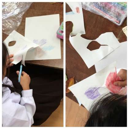 図画工作の時間に、運動場に落ちている葉っぱを拾い、色鉛筆でこすりだしをしました。様々に色がついた落ち葉を動物や乗り物に見立て、いろいろなものを作りました。11月の正面玄関に飾る予定です。どんなできあがりになるか、楽しみです。