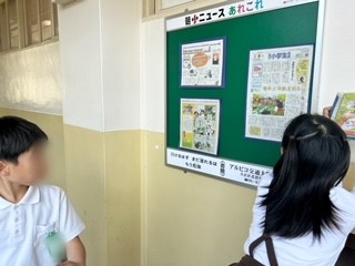図書室前に掲示している子ども新聞を読んでいる子どもたちです。子どもたちにとって関心があり、読みやすい記事なので立ち止まって読んでいます。
