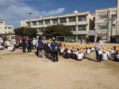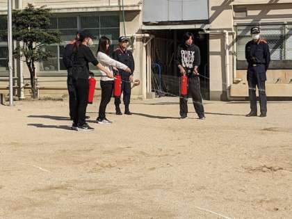 「家庭科室より火災発生」を想定した避難訓練を行いました。大正消防署からも来ていただき、消火器を使った訓練も行いました。