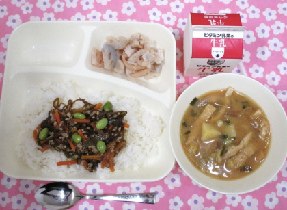 「さつまいものみそ汁」は、にぼしでだしをとり、鶏肉、さつまいも、はくさい、たまねぎ、青みに青ねぎを使用しています。