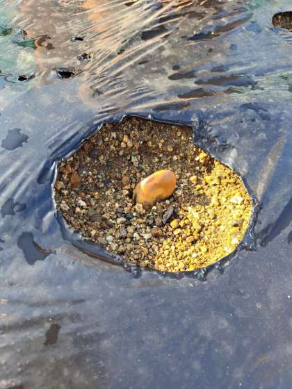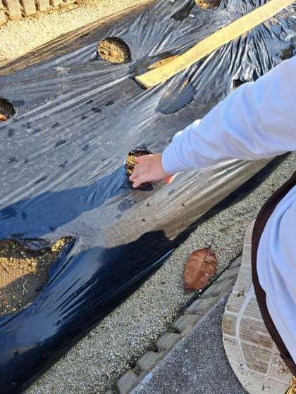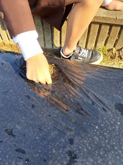 秋になり、なかよし学級ではそら豆を育てています。水やりをするうちに、うえた豆がひょっこり出てきたので、再び土の中に人差し指で押し込みました。