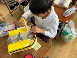 今日の図工の時間は立体作品作りです。この作品を作品展に出すので、子どもたちは気合十分。黙々と自分の作業に取り組んでいます。同じ材料でも子どもによって全く違う使い方や飾り方をするのですごく興味深いです。