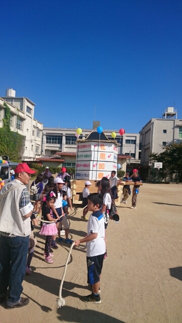 18日(水)、すばらしい晴天のもと、第41回大正区民まつりが実施されました。金曜日の夜に地域の方々によって組み立てられた花車も、朝の運動場で出番を待っています。