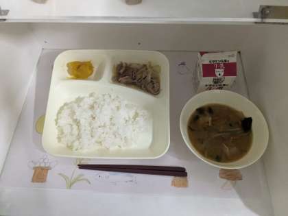 「豚肉と野菜のいためもの」は、豚肉、キャベツ、たまねぎをいため、塩、こいくちしょうゆで味つけします。