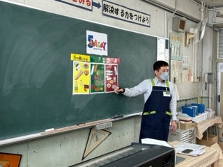 社会科の出前授業でライフの方が来てお話をしてくださいました。鬼ごっこをしながら食品ロスについて学んだり、○×ゲームをしたりしました。楽しくゲームをしながら学ぶことができました。ありがとうございました。