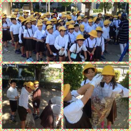 月曜日、5時間目にクリーン大阪を行いました。3年生と5年生で北村公園を清掃しました。たくさんの落ち葉だけでなく、たばこの吸い殻やペットボトルなどの生活に関わるゴミもたくさんありました。自分たちもゴミを出さないように気を付けなければいけないと気づく機会になりました。また、子どもたちは清掃活動により、清々しい気持ちになりました。