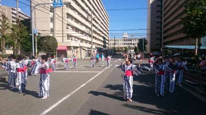 パレードの途中、泉尾浜公園の横で婦人会のおどりが披露されました。音頭の音楽に気づいて、たてものの窓から顔を出し、楽しそうにおどりをながめる方たち。その表情がうれしそうで、とても印象的でした。盆踊りとはまたちがった雰囲気です。