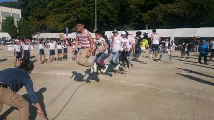 いよいよ子どもと大人が一致団結して、がんばる時がきました。そうです。地域対抗大縄跳びです。子どもの部20人、大人の部10人。人数が集まらないので、観客席の顔見知りの方にも声をかけます。練習タイムでなかなかうまく跳べなくても、やっぱり本番はちがいます。一番の記録が出ました。惜しくも入賞はなりませんでしたが、気持ちを一つにしてがんばった一体感が残りました。