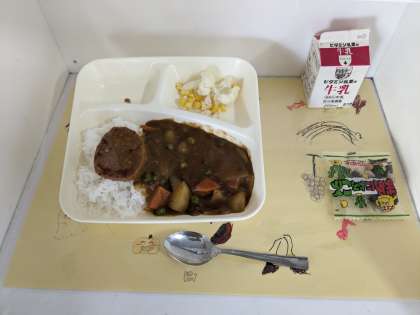 「ハンバーグカレーライス」は、牛肉を主材としたカレーライスに、焼き物機で焼いたミニハンバーグを添えます。