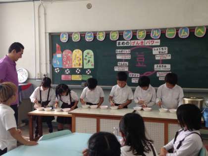 給食の後は班対抗の豆つかみリレーを行いました。おはしで上手に豆をつかむ人が多く、接戦で大盛り上がり。1位の班には「豆賞状」が授与されました。