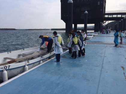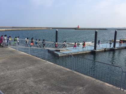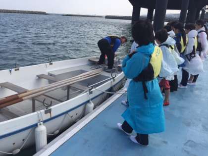海洋センターに移動して、海のプログラムを始めます。今日はカッター体験です。昨日のOPヨットは2人で乗りましたが、カッターは全部で4艇、1艇に十数名乗り込みます。