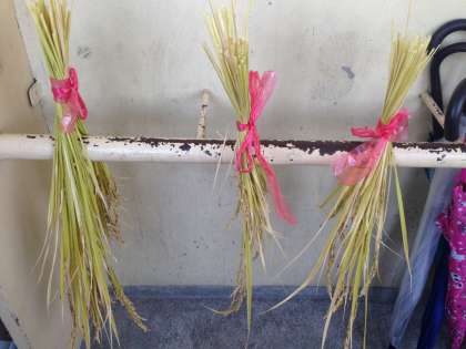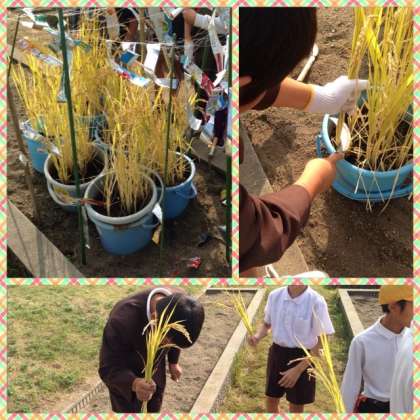 木曜日、5年生は待ちに待った稲刈りを行いました。一人ひとり鎌を持ち自分の手で稲を刈っていきました。その後、教室の前のところに干しました。次の工程に入るまでまたしばらく置いておきます。