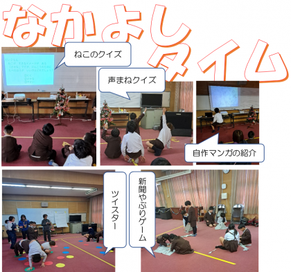 2学期を楽しい思い出を作って終えようと考え、なかよしタイムでゲームなどをしました。高学年の子どもたちの出し物や先生たちによるゲームをみんなで楽しみました。どの子も思い思いに楽しむことができました。高学年は司会進行もして活躍しました。内容は次の通りです。