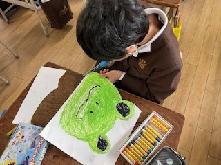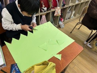 劇「かえるのつなひき」で使う小道具を作っている様子です。自分で考え工夫して作っています。