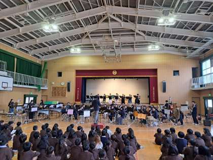 大阪教育大学吹奏楽部のみなさんにすばらしい演奏を聴かせていただきました。管楽器を中心とする本物の楽器の大きさを知ったり、音色の迫力を肌で感じたりすることができました。子どもたちの知っている曲が多く、楽しく聴くことができました。大阪教育大学のみなさん、ありがとうございました。