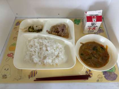 「豚肉のしょうが焼き」は、豚肉にしょうが汁、砂糖、料理酒、みりん、こいくちしょうゆ、綿実油で下味をつけ、たまねぎを混ぜ合わせて、焼き物機で焼きます。
