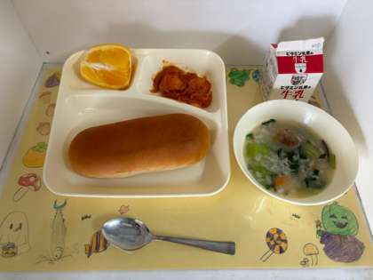 「中華がゆ」は、肉だんごを使った児童に好評な献立です。だいこん、にんじん、しいたけ、彩りにチンゲンサイを使っています。ごま油を使用することで、中華らしさを出しています。