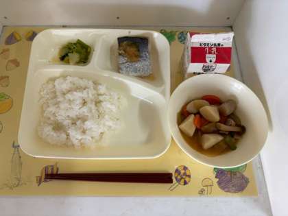 「さといもと野菜の含め煮」は、さといもの他に、鶏肉、つなこんにゃく、たまねぎ、にんじん、しめじ、青みにさんどまめを使用した煮ものです。
