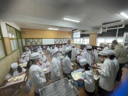 今日から給食が始まりました。初めての給食にドキドキワクワクの様子でした。6年生が給食室での食器などの受け取り方や配膳の仕方を教え、1年生はしっかりとその姿を見ていました。1年生は一人ひとりに合った量をしっかり食べることができました。