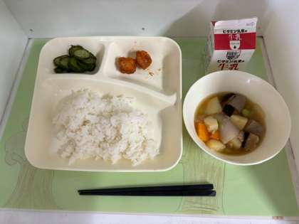 「豚肉と野菜の煮もの」は、豚肉を主材に、じゃがいも、つなこんにゃく、たまねぎ、にんじん、しいたけ、青みにむきえだまめを使用しています。