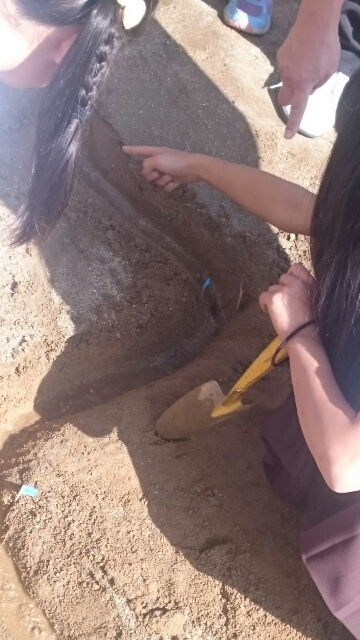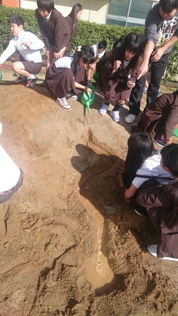 5年生が理科の「流れる水のはたらき」の実験をしました。運動場の盛土を利用して、人口の川を作り、じょうろで上から水を流します。いろいろ観察しますが、ポイントは曲がるところの内側と外側です。流れる水が土にどのような影響を与えるか、そのちがいを子どもたちはよく見ていました。泥で遊ぶ快感を思い出したのか、とても楽しんで実験に取り組んでいました。