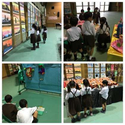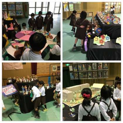 作品展が始まりました。作品展がどんなものかわからなかった1年生も講堂に行って、他の学年の作品を鑑賞しました。