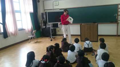 金曜日。今日もスコット先生が来てくれました。ふだんは5・6年生を中心に外国語活動を行いますが、それ以外の学年も体験しています。今日は1年生に英語を教えてくれました。