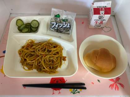 「カレースパゲッティ」は、豚ひき肉を主材に、ベーコンで旨みを増し、カレールウの素などで味つけしたスパゲッティです。児童に好評な献立です。