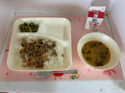 「豚ひき肉とにらのそぼろ丼」は、豚ひき肉、たまねぎ、にんじん、青みににらを使っています。ご飯がすすむ一品です。