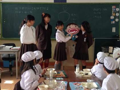 今日から、保健委員による歯みがき指導が始まりました。はみがきじょーずくん人形を使って、今日は1年1組のみなさんと一緒に、歯ブラシの持ち方やみがき方を勉強しました。