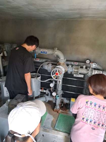 安全・安心な水質を保つためにプールにはろ過機が付いています。たくさんの手順を一つひとつみんなで確認しました。