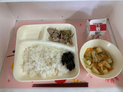 「五目汁」は、とうふ、うすあげ、たまねぎ、キャベツ、にんじん、青みに青ねぎを使用しています。