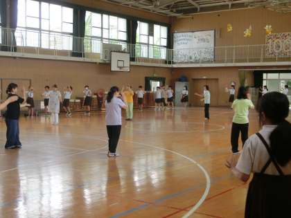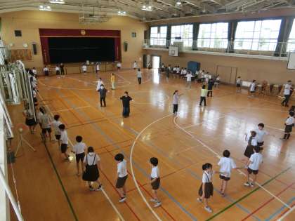 地域の女性会の方々を中心に、高学年児童に対して盆踊りの指導を行っていただきました。夏休みに行われる盆踊り大会に向けての取組です。
