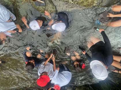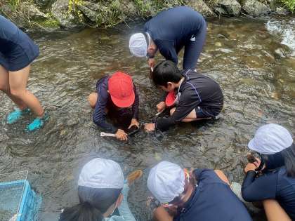 最終日に色づけをする焼き板を、川の水で磨きます。まるで温泉につかるようにして、一生懸命磨いています。