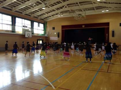 さあ、いよいよフラの体験です。女の子と希望者は、フラの衣装を身に着けて、臨みました。4拍子で足のリズムはそんなに難しくないのですが、リズムに合わせて腰を動かすのがとても難しく、さらに手をしなやかに優雅に動かすこともとても難しかったようです。