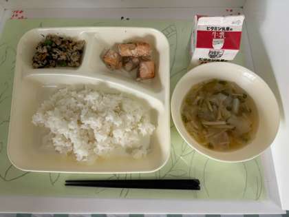 「さけのつけ焼き」は、さけ(角)に料理酒、砂糖、こいくちしょうゆで下味をつけ、焼き物機で焼きます。
