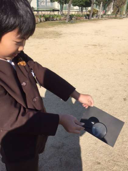 校庭で、黒い画用紙と虫めがねを持って実験に取り組みました。