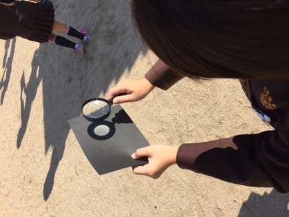 理科の学習で、「虫めがね」を使って光を集める実験をしました。