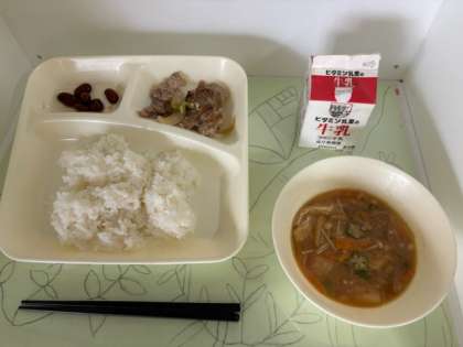 「豚肉の甘辛焼き」は、豚肉に料理酒、砂糖、こいくちしょうゆで下味をつけ、たまねぎ、ピーマンと混ぜ合わせ、焼き物機で焼きます。