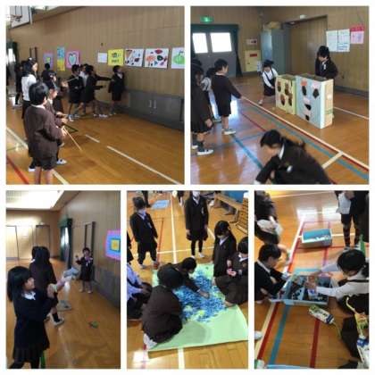 いよいよ当日!はじめに2年生の司会が挨拶をしました。それからみんなで遊びました。たくさんのお店があり、1年生も班の友だちと相談しながら仲良くまわることができました。
